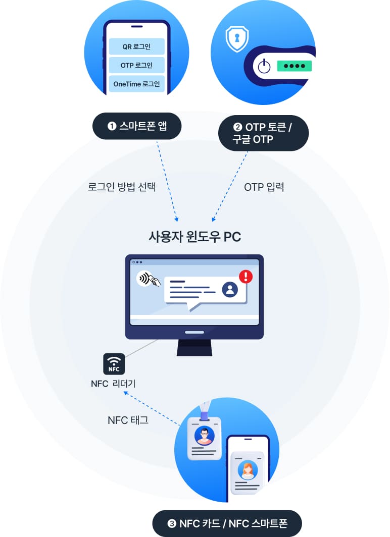 WinLogin은 PC 로그인 시 불편한 비밀번호 입력을 대신해, 스마트폰 앱 · OTP · NFC