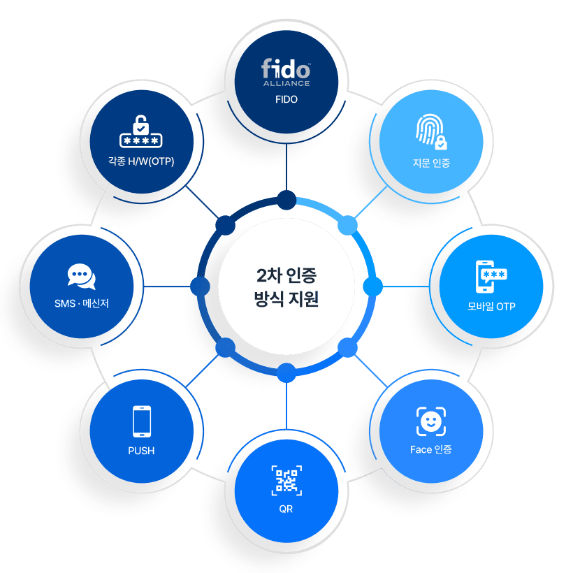 - 비밀번호, 모바일 간편인증(푸시 알림), OTP(토큰·모바일), 생체인증(지문/얼굴)