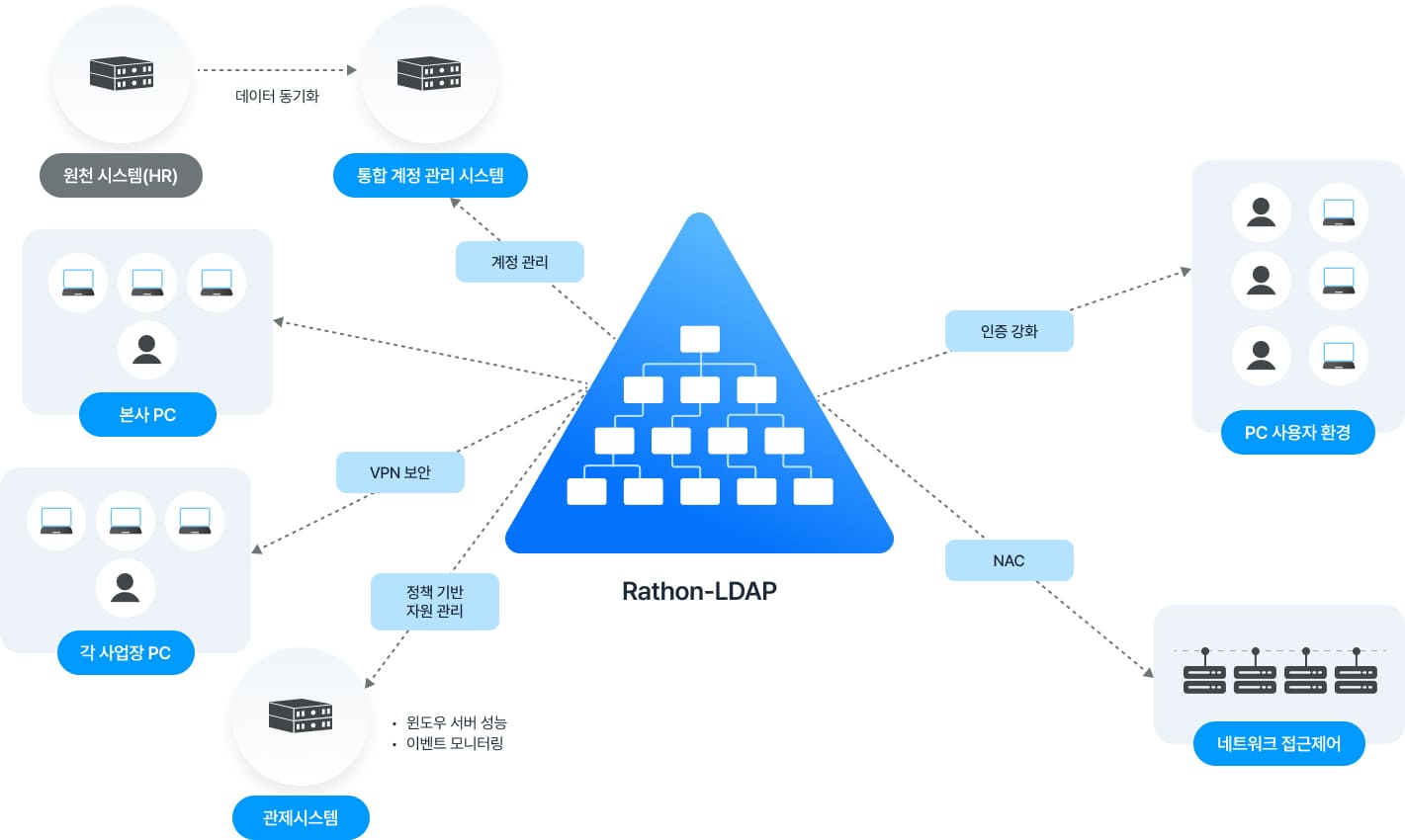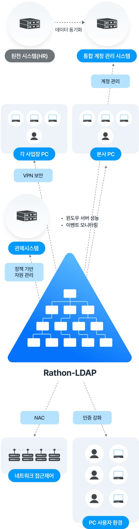 시스템 계정을 중앙에서 통합 관리합니다. 이를 통해 보안성을 강화하고 운영 효율성을