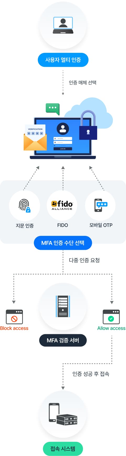- 사용자 역할, 접속 위치, 디바이스 보안 상태 등에 따라 맞춤형 인증 정책 적용