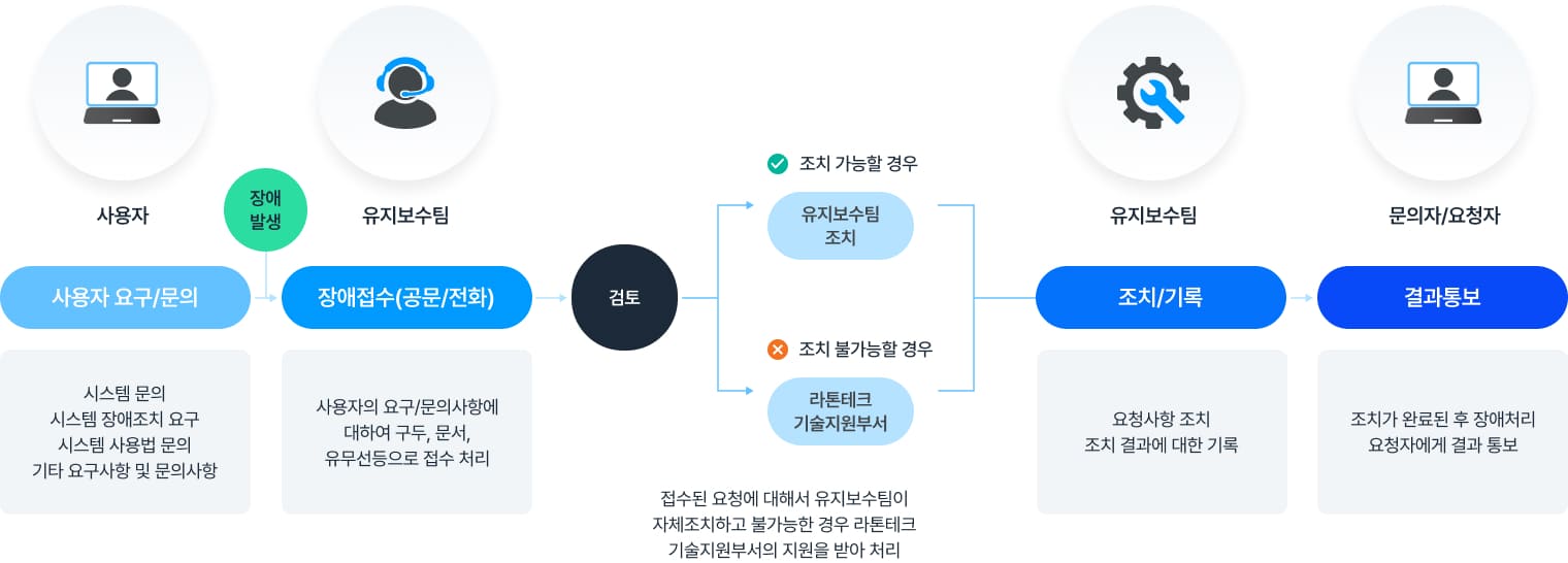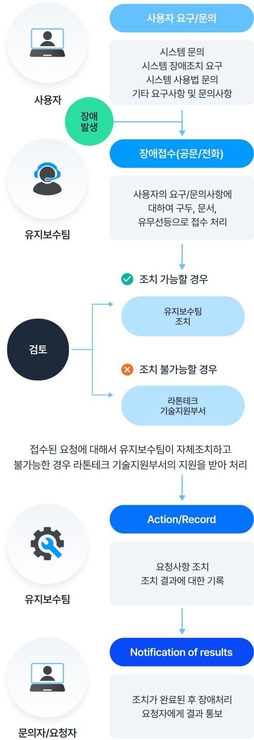 4단계의 장애대응 프로세스를 가동하여 효율적인 유지보수가 되도록 지원합니다.